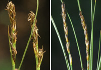 Kobresia simpliciuscula (left) is a circumboreal species that extends south through the Rocky Mountains to New Mexico. The 1973 Flora indicates it is not recorded from Montana. It has since been found in scattered locations throughout western Montana. Kobresia myosuroides (right) has a similar distribution and is not listed as occurring in Washington in the 1973 Flora. Specimens collected in the late 1970s now document it from the North Cascades of Washington and southern British Columbia. (photos: Ben Legler)